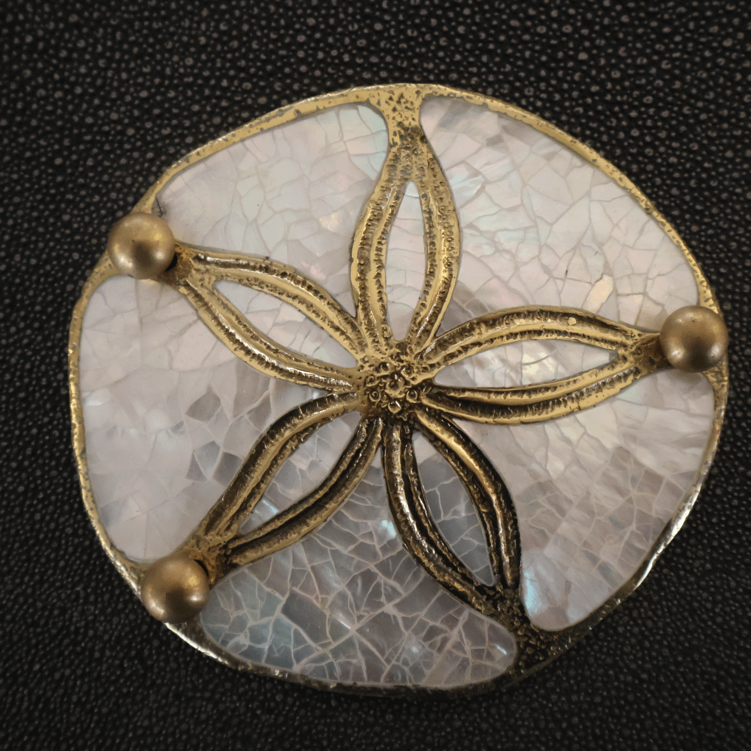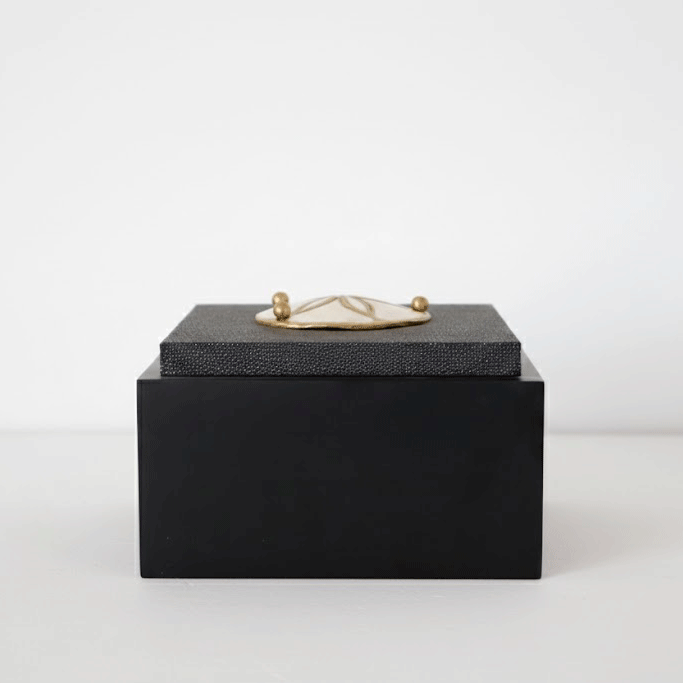 Esta caja decorativa, con acabado en galuchat negro, destaca por su tapa ornamentada con un medallón de madreperla y detalles en latón. La textura sutil del galuchat contrasta de manera elegante con los destellos nacarados de la madreperla, creando un efecto visual que equilibra lo clásico y lo contemporáneo. Un diseño refinado que aporta un toque de distinción a cualquier espacio, ideal para almacenar objetos personales o simplemente como una pieza decorativa que añade sofisticación a tu hogar.