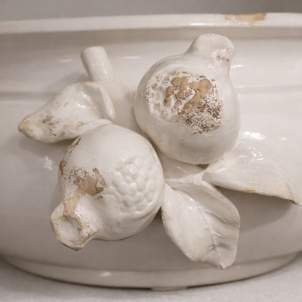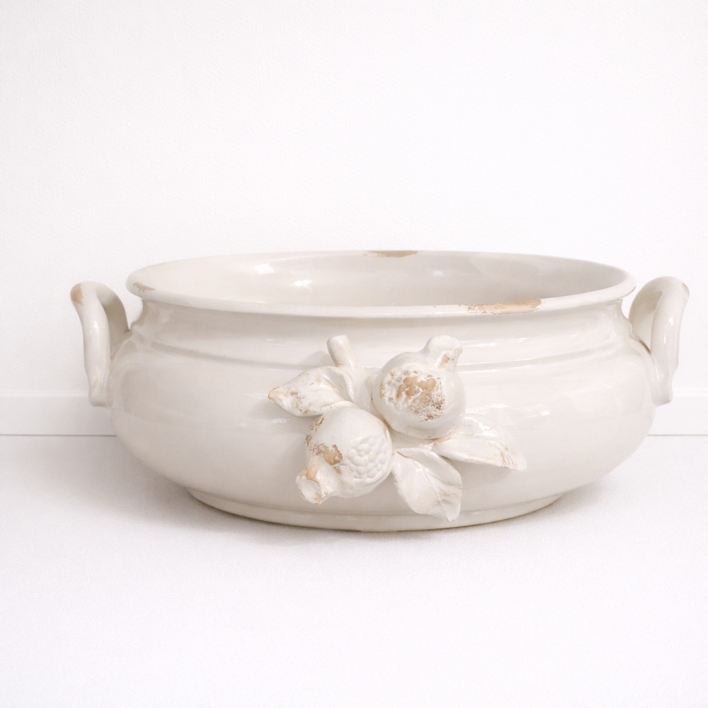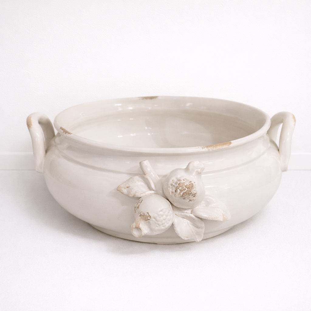 Centro de cerámica blanca con asas laterales y decoración frontal en relieve de frutos. Su acabado envejecido realza el carácter artesanal y atemporal de la pieza. Ideal como centro de mesa o elemento decorativo con historia.