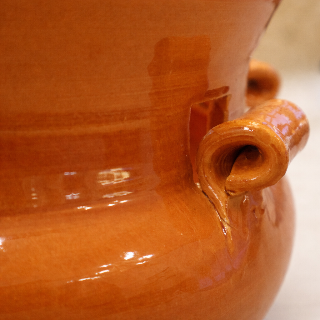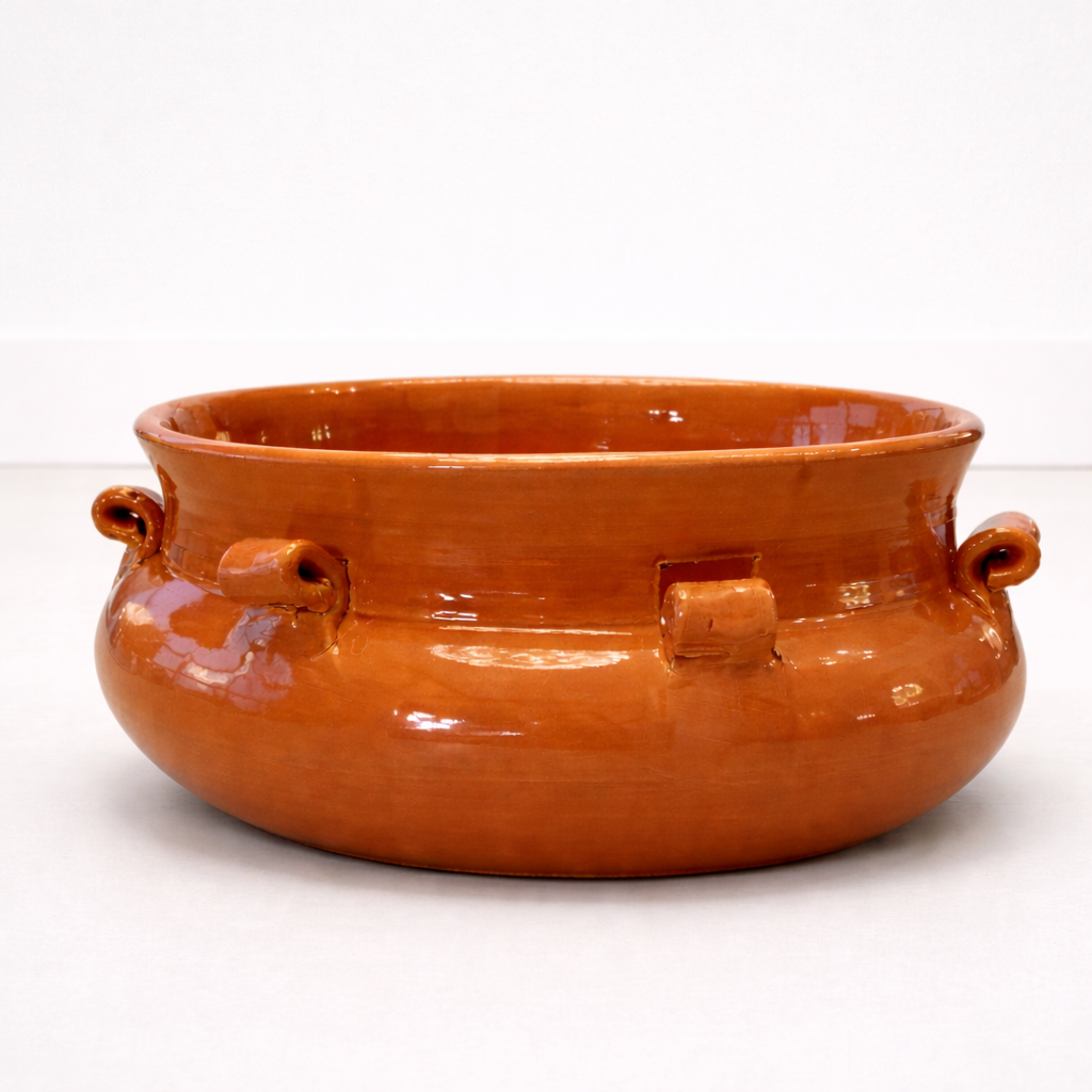 Pieza cerámica redonda de terracota, con un acabado brillante y cálido en un tono anaranjado intenso característico del barro cocido esmaltado. Su forma es achatada y ancha, con una boca ligeramente más estrecha que el cuerpo. En el contorno se integran asas decorativas dispuestas de manera simétrica, modeladas con un diseño enrollado que aporta un toque artesanal.