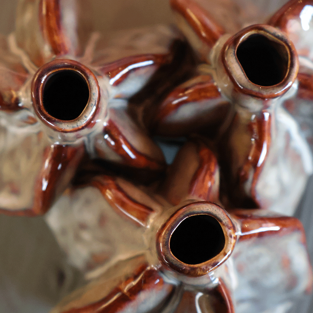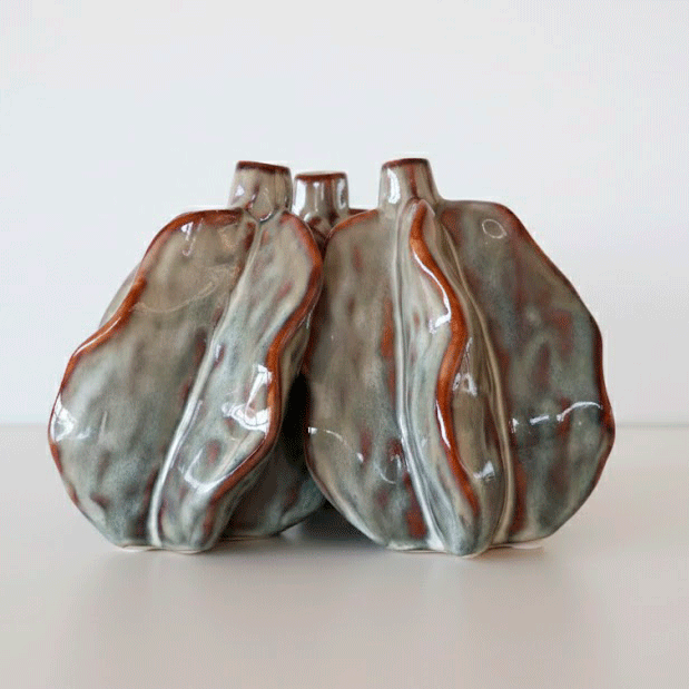 Transforma cualquier rincón en una galería de arte con este set de jarrones de cerámica. Su diseño, inspirado en las formas asimétricas de la naturaleza, con tonalidades gris humo, verde oliva y bordes en contraste color óxido. Su diseño compacto es ideal para estantes, consolas o mesas de centro.